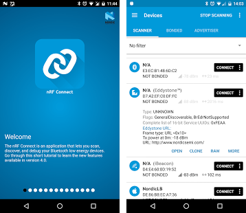 nRF connect предназначена для сканирования и обнаружения списка доступных bluetooth-устройств. Как обычно, запускаем программу — активируем bluetooth — включаем GPS — нажимаем кнопку «Далее» и разрешаем приложению получить информацию о местонахождении смартфона.